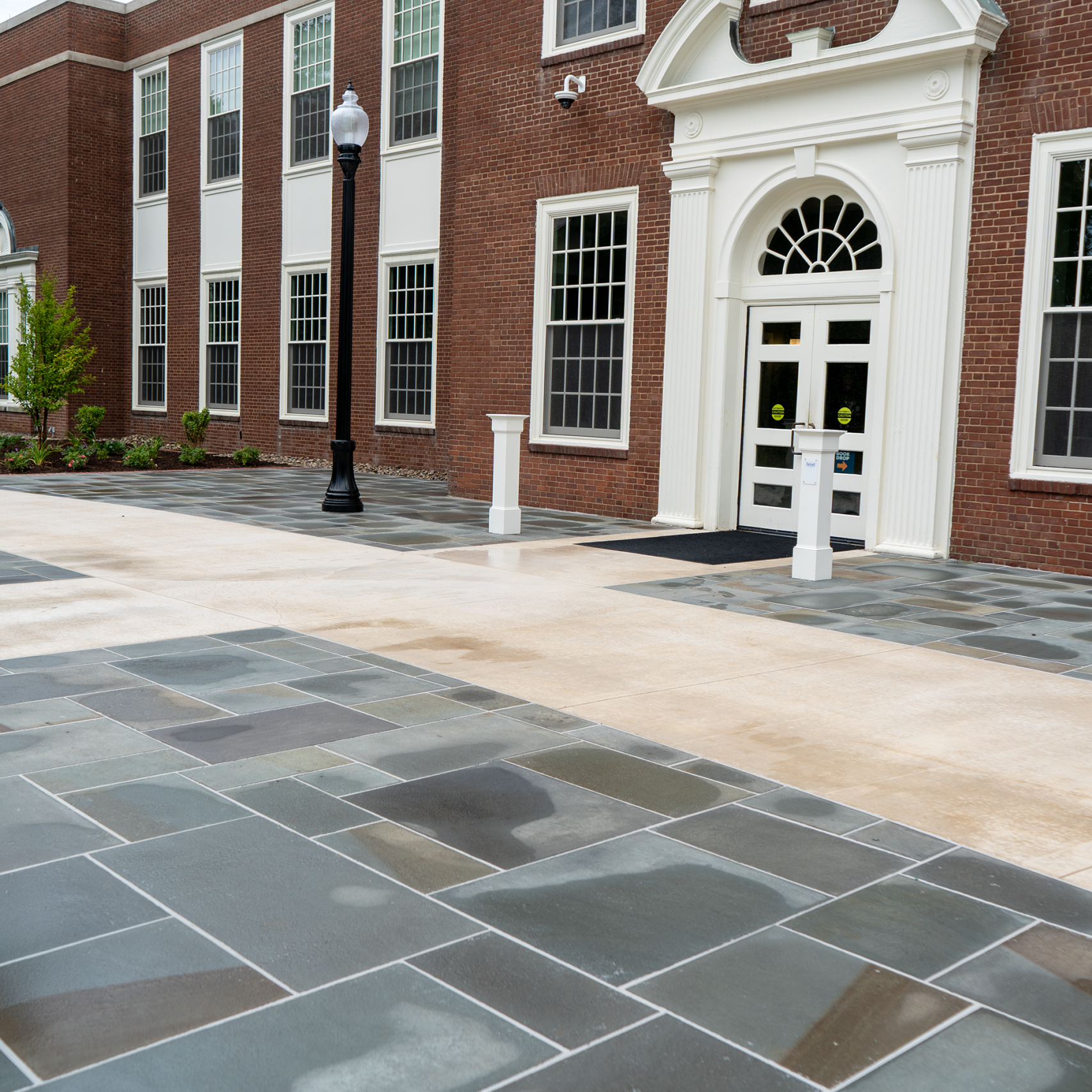 Additional site improvements consist of new concrete sidewalks and pads, asphalt walkways, specialty paver systems, and related site work required to support the upgraded entrance plaza. The project also includes repairs to an existing underground utility tunnel located beneath the patio area to ensure the continued functionality of campus infrastructure.